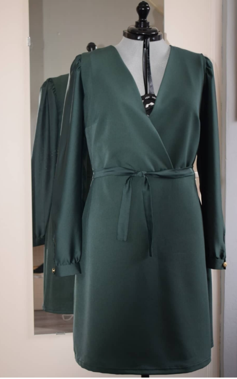 ''Prachtige mosgroene jurk op maat gemaakt. De satijnen pofmouwen en het ceintuurtje maken de jurk chique en vrouwelijk. De groene stof met een licht structuurtje geeft er een stoer tintje aan!